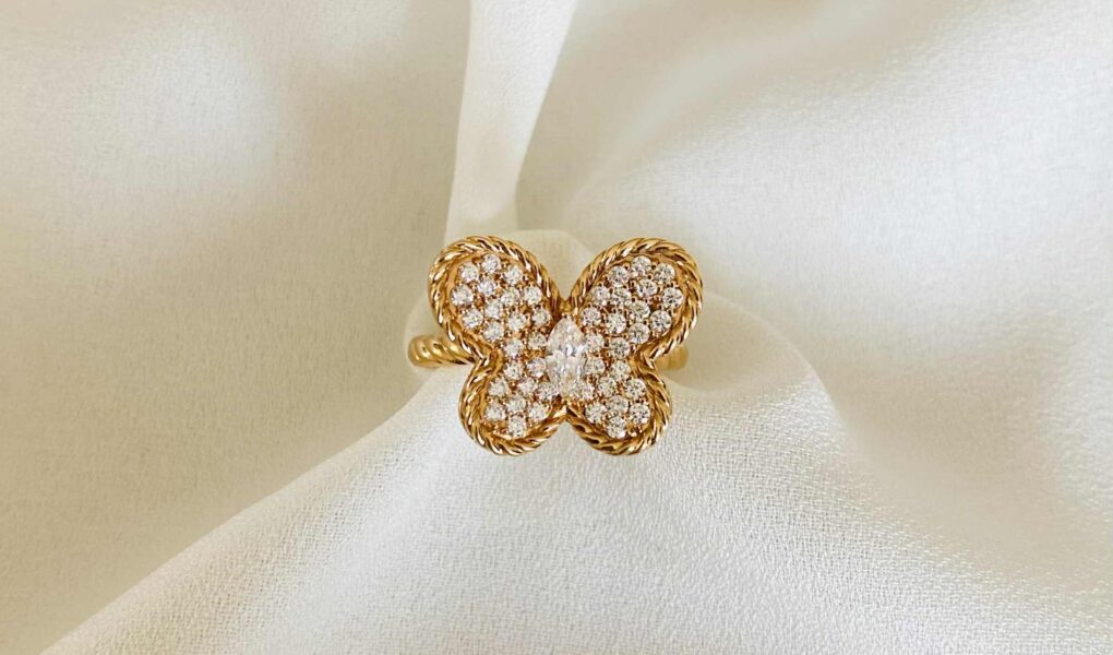 Bague neuve en or rose 18 carats stylisant un papillon, sertie d’ un diamant taille navette dans un pavage de diamants taille brillant.