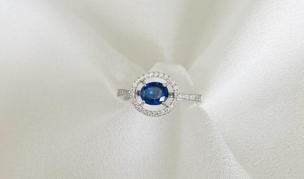 | Bague neuve en or blanc 18 carats sertie d’un saphir de Ceylan d’environ 0,40 carat dans un entourage de diamants. |