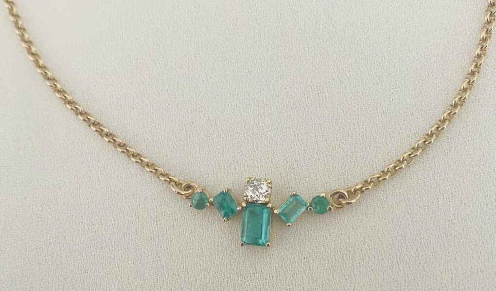 | Collier maille jaseron en or jaune 18 carats retenant un diamant d’environ 0,18 carat et 5 émeraudes. |