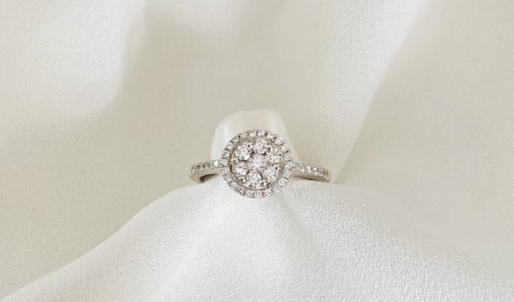 | Bague en or blanc 18 carats centrée de diamants entourés et épaulés de diamants. |