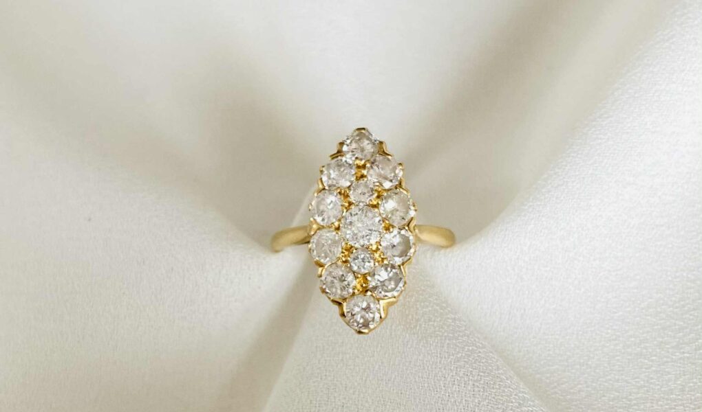 | Bague marquise en or jaune 18 carats sertie de diamants pour un total de 1,80 carat. |