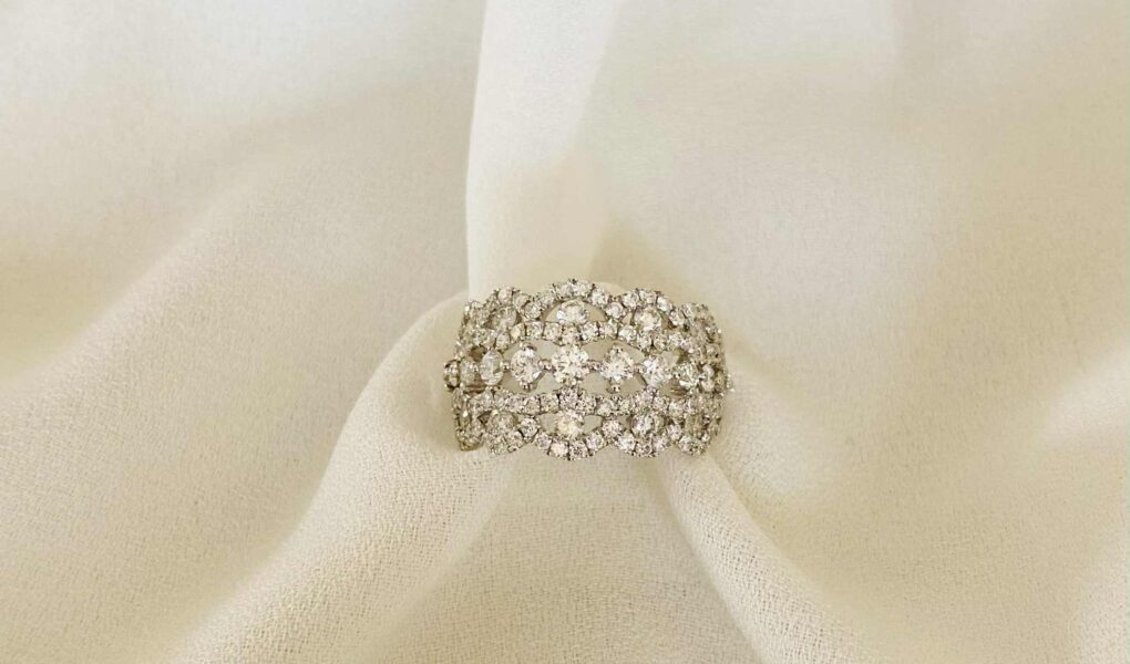 | Bague neuve en or blanc 18 carats à décor de dentelle sertie de diamants taille brillant pour environ 1,80 carat. |