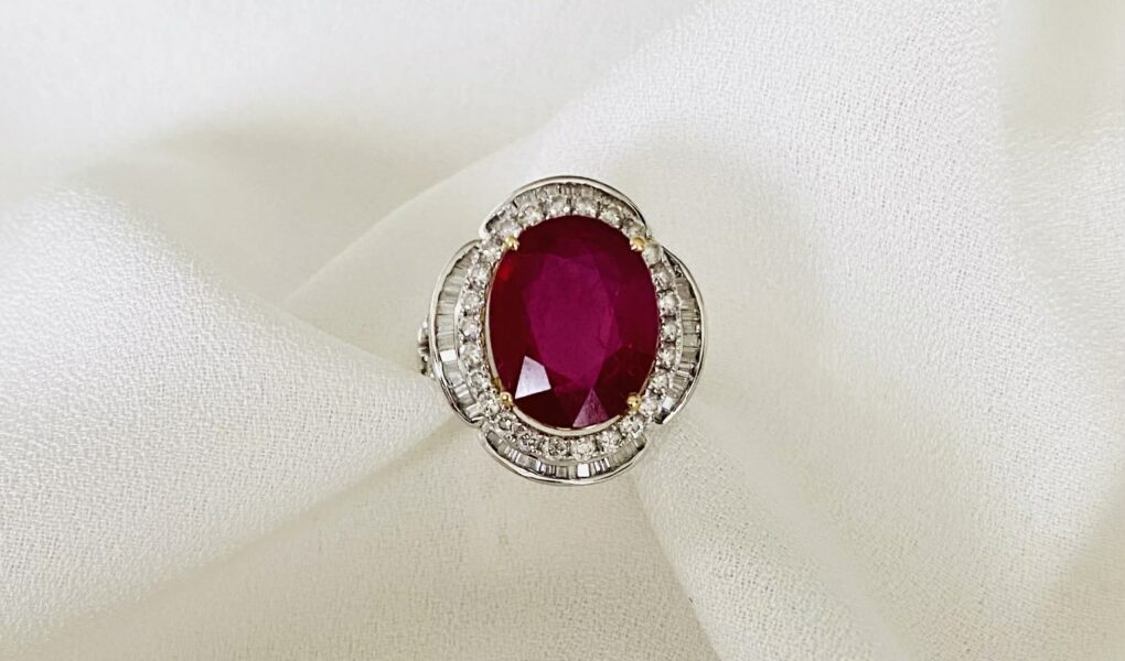 | Bague en or blanc 18 carats sertie d’une pierre de synthèse dans un double entourage de diamants taille brillant et taille baguette. |