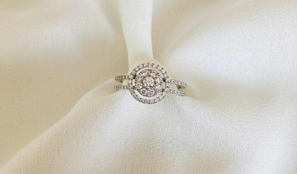 | Bague neuve en or blanc 18 carats sertie de diamants taille brillant dans un entourage de diamants et épaulés de diamants. |