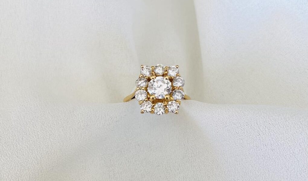 Bague marguerite en or jaune 18 carats sertie d’un diamant taille moderne d’environ 0,70 carat dans un entourage de diamants.