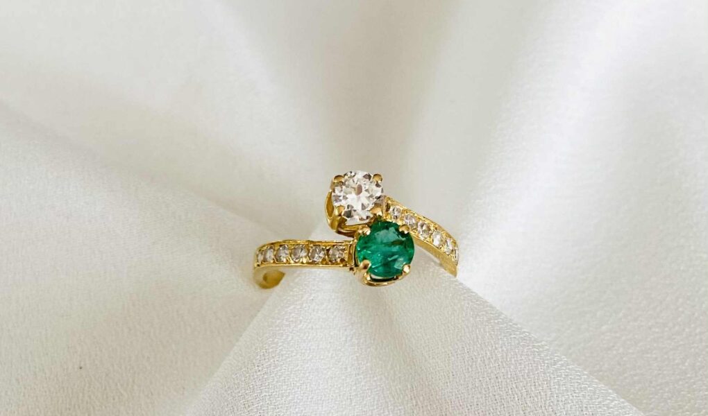 Bague « toi & moi » en or jaune 18 carats sertie d’un diamant taille brillant d’environ 0,35 carat et d’une émeraude épaulés de diamants.