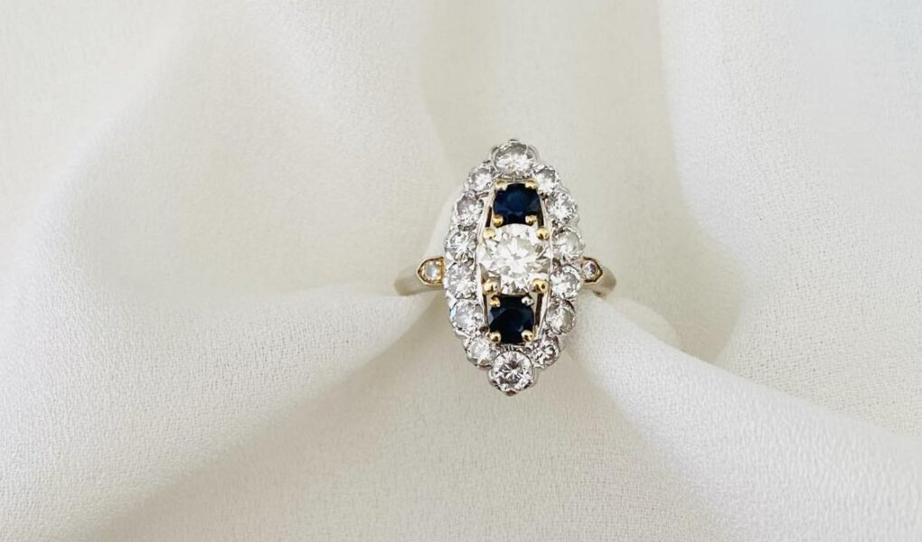 | Bague marquise en or jaune 18 carats (rhodiée or blanc) pavée de 2 saphirs ronds, un diamant central taille moderne d’environ 0,50 carat, entourage de 14 diamants taille moderne en chute pour environ 1,20 carat. |