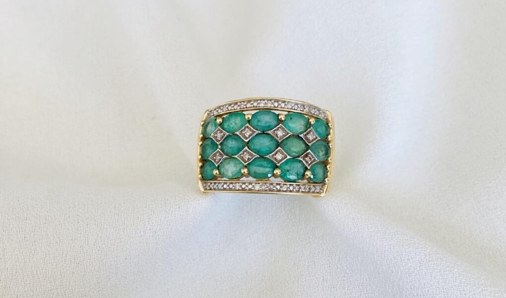 | Bague en or jaune 18 carats sertie de 15 émeraudes taille navette intercalées de petits diamants. |