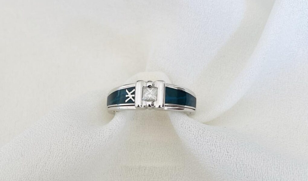 | Bague neuve de la maison KORLOFF en or blanc 18 carats, siglée, émaillée vert foncé et sertie d’un diamant d’environ 0,15 carat. |