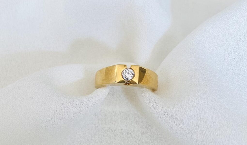 Bague neuve de la maison KORLOFF en or jaune 18 carats siglée et sertie d’un diamant d’environ 0,20 carat.