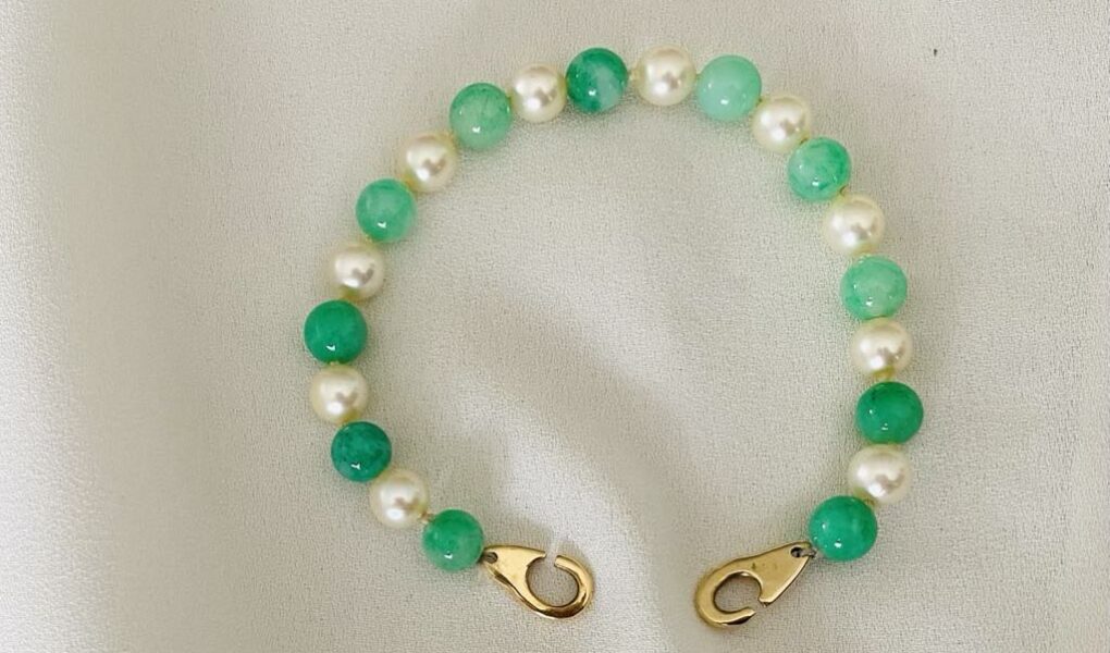 | Bracelet de perles de culture alternées de perles de jade (diamètre 8 mm). Fermoir menottes en or jaune 14 carats. |