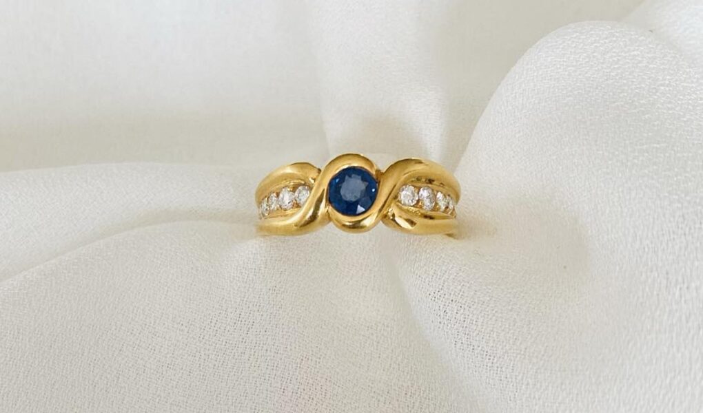 | Bague neuve en or jaune 18 carats sertie d’un saphir d’environ 0,40 carat épaulé de diamants pour environ 0,31 carat. |