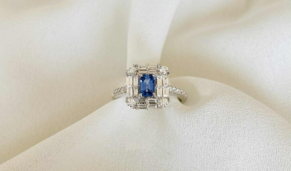 | Bague neuve en or blanc 18 carats sertie d’ un saphir dans un entourage de diamants taille baguette et épaulé de diamants taille brillant. |