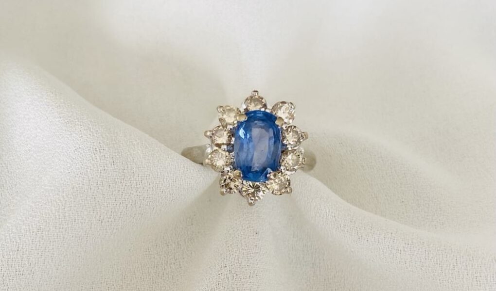 | Bague en or blanc 18 carats sertie d’ un saphir (présumé Ceylan) d’environ 2,40 carats dans un entourage de 10 diamants pour environ 1,50 carat. |