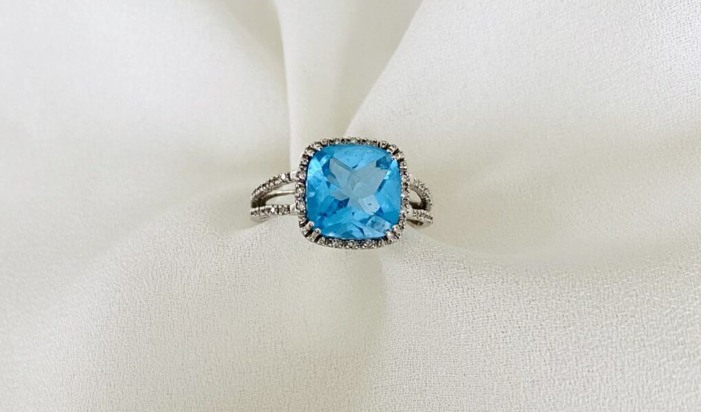 | Bague en or blanc 18 carats sertie d’une topaze entourée et épaulée de petits diamants. |