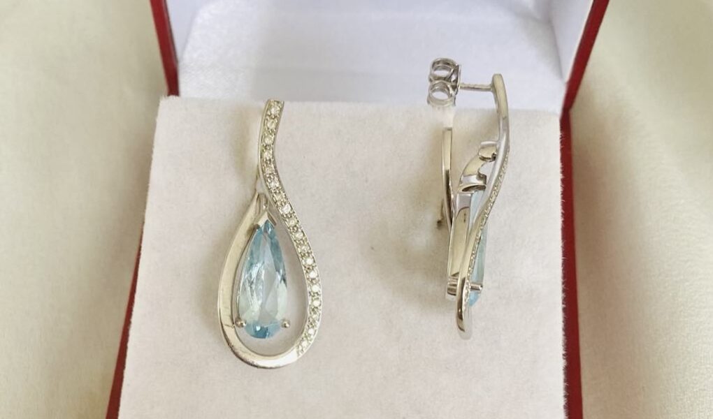 | Boucles pendantes en or blanc 18 carats serties d’ une topaze taille poire et d’une ligne de diamants. |