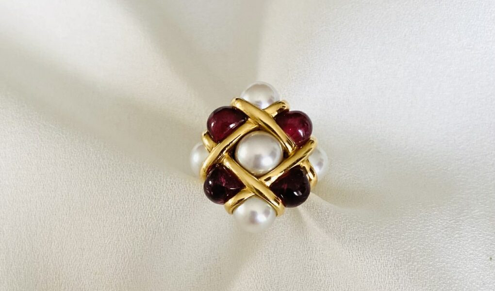 Bague en or jaune 18 carats. Chaton quadrillé alternant 5 perles de culture et 4 perles de tourmaline rose.